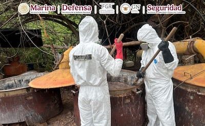 RRC/Culiacán: Las autoridades mexicanas, encabezadas por la Secretaría de Marina (Semar), en coordinación con la Secretaría de la Defensa Nacional (Sedena), la Fiscalía General de la República (FGR), la Guardia Nacional (GN) y la Secretaría de Seguridad y Protección Ciudadana (SSPC), desmantelaron un laboratorio clandestino en el municipio de Abuya, Culiacán, Sinaloa.