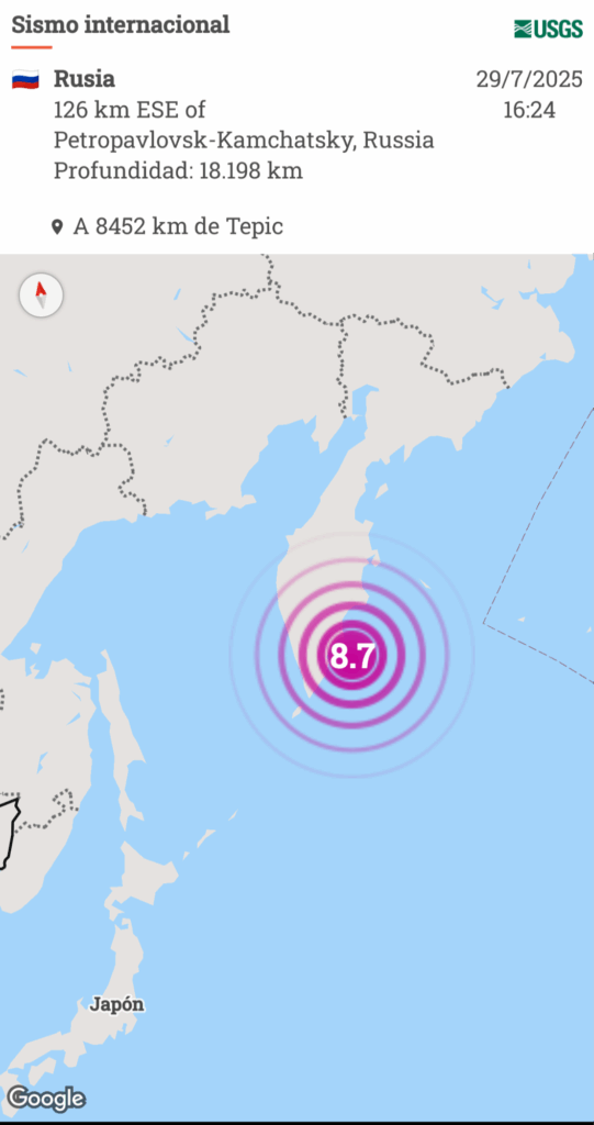 RRC/Rusia: Un terremoto de magnitud 8,7 ocurrió el 29 de julio de 2025 frente a la costa este de la Península de Kamchatka, Rusia, siendo el más grande desde el megaterremoto de Japón de 2011 (magnitud 9,0-9,1). El sismo, que tuvo una profundidad de 19,3 km, se localizó a unos 125-136 km al este-sureste de Petropavlovsk-Kamchatsky, una ciudad con 165,000 habitantes. Según el Servicio Geológico de Estados Unidos (USGS), el evento ocurrió en la zona de subducción del Pacífico bajo la placa del Mar de Ojotsk, una región conocida por su intensa actividad sísmica dentro del Anillo de Fuego del Pacífico.