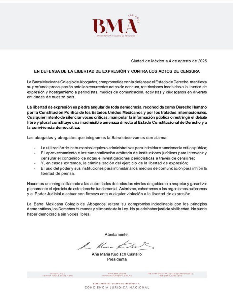 La Barra Mexicana subrayó que la libertad de expresión es un pilar fundamental de la democracia, reconocido como un derecho humano en la Constitución mexicana y en tratados internacionales, y cualquier intento de silenciar voces críticas constituye una amenaza directa al Estado de derecho y la convivencia democrática.