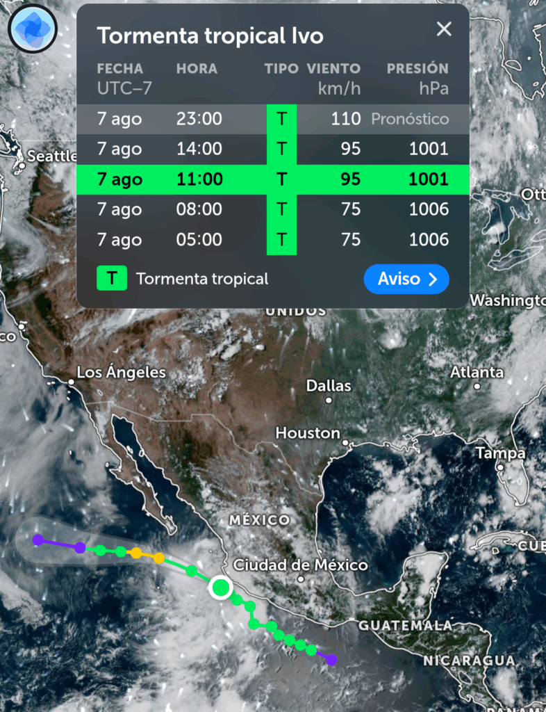 - Trayectoria: Ivo no tocará tierra en México y se desplazará a lo largo de las costas del Pacífico, alejándose gradualmente del territorio nacional. Para el sábado 9 de agosto, podría debilitarse nuevamente a tormenta tropical, y el 11 de agosto se degradaría a una baja presión remanente en el océano.