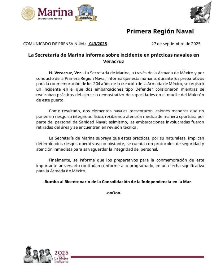 Veracruz (RRC): Durante los ensayos previos a la conmemoración del 204 aniversario de la Armada de México en el Malecón del Puerto de Veracruz. Dos lanchas interceptoras tipo Defender de la Secretaría de Marina-Armada de México (SEMAR) colisionaron mientras realizaban maniobras de práctica en la bahía, frente a turistas y ciudadanos que observaban el evento.