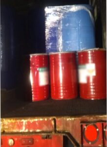 Durante el cateo del vehículo, se incautaron más de 300 tambos (barriles) con aproximadamente 11,000 litros de sustancias químicas, las cuales requieren permisos especiales para su transporte y son reguladas por su potencial uso en la producción ilícita de narcóticos.