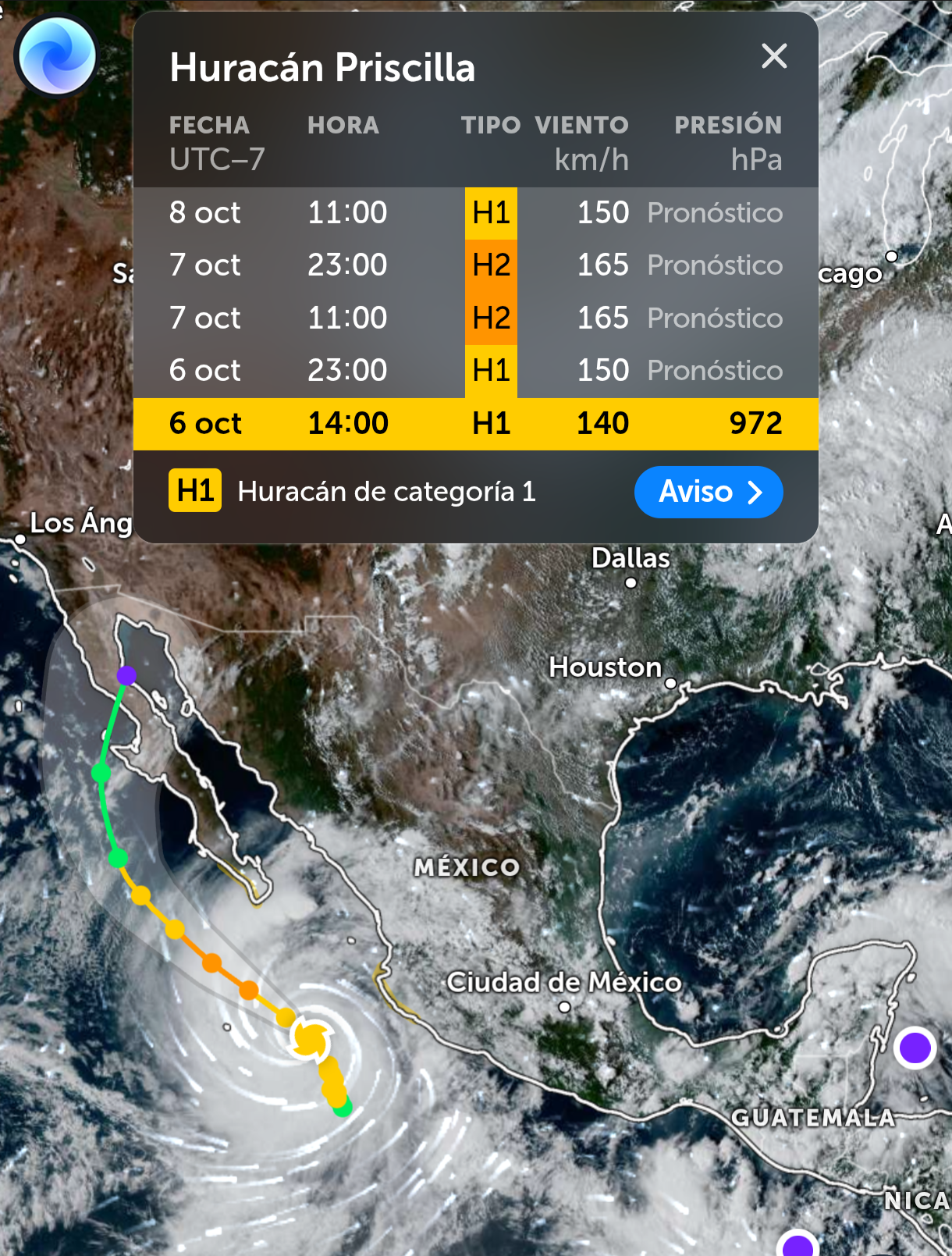 Tepic (RRC): El huracán Priscilla se ha intensificado y ampliado su tamaño, pero se mantiene en categoría 1 en la escala Saffir-Simpson, con vientos máximos sostenidos de 120-140 km/h y rachas de hasta 170 km/h. Según el último boletín del Centro Nacional de Huracanes (NHC) de EE.UU. y la Comisión Nacional del Agua (Conagua) de México, su centro se localiza aproximadamente a 335-390 km al suroeste de Cabo Corrientes, Jalisco, y a unos 595 km al sur-sureste de Cabo San Lucas, Baja California Sur. Se desplaza lentamente hacia el noroeste o nor-noreste a 6-11 km/h, lo que le da tiempo para fortalecerse potencialmente a categoría 2 en los próximos días