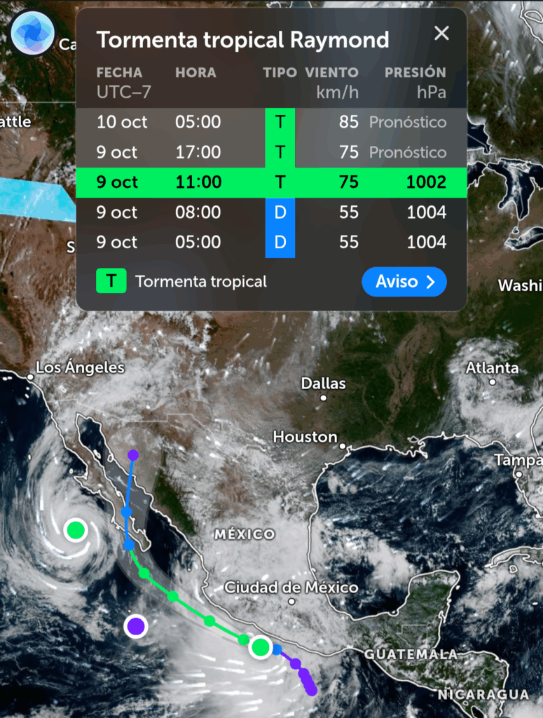 Según los modelos del Servicio Meteorológico Nacional (SMN) de México y el Centro Nacional de Huracanes (NHC) de EE.UU., Raymond se desplazará paralelo a la costa del Pacífico mexicano durante los próximos días, sin tocar tierra directamente, pero generando efectos indirectos. Hacia el 12-13 de octubre, podría girar al oeste y alejarse hacia mar abierto.