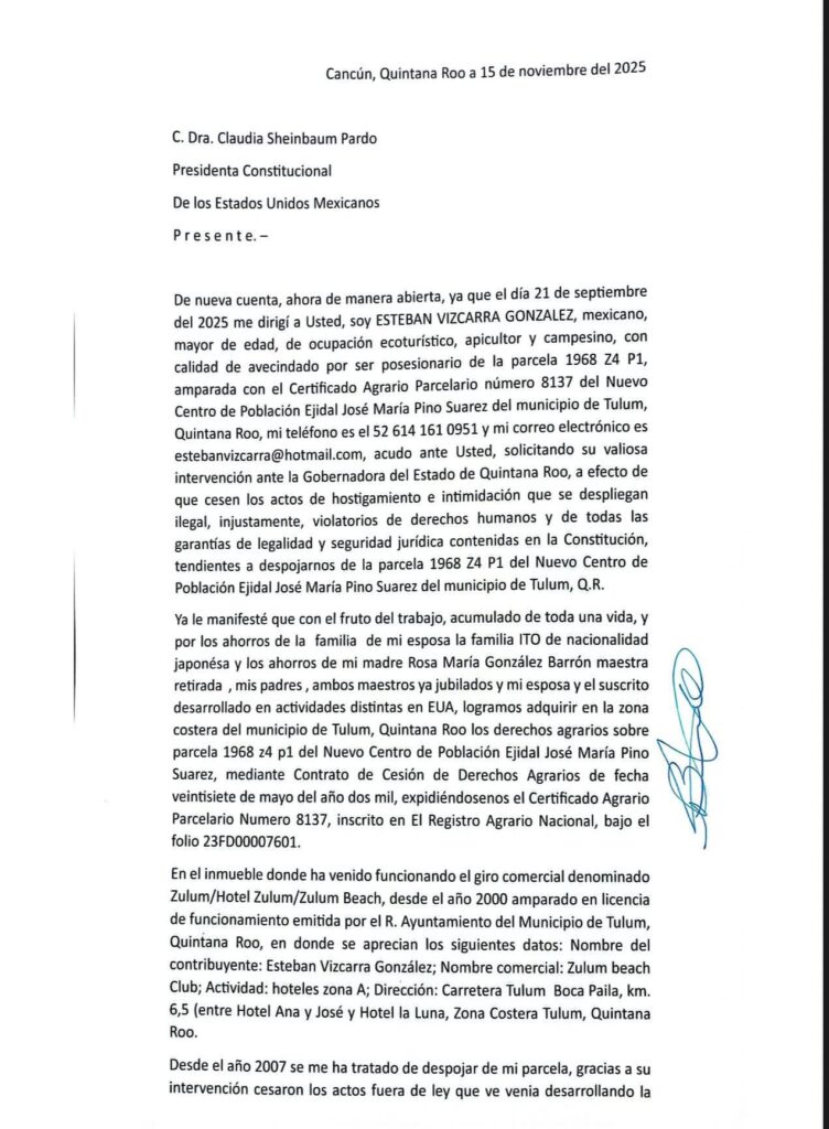 El denunciante indicó que, durante su retención, dos personas que aseguraron ser representantes de la Fiscalía de Tulum lo presionaron para desocupar el terreno “por las buenas” o enfrentar consecuencias legales. Según su testimonio, los agentes aseguraron que diversos procesos legales en curso —incluidos expedientes ante el juzgado civil, el Tribunal Agrario, amparos federales, un decreto presidencial y un certificado parcelario vigente— “carecían de validez” para la autoridad actuante.