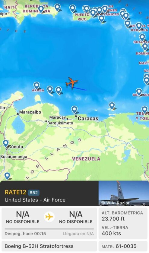 Caracas, Venezuela (RRC): Un bombardero estratégico B-52H Stratofortress de la Fuerza Aérea de Estados Unidos ha sido detectado en las últimas horas volando en las proximidades de las costas venezolanas, según datos de seguimiento aéreo público como Flightradar24. El avión, conocido por su capacidad para portar armas convencionales o nucleares, realizó un patrullaje prolongado en aguas internacionales del Caribe, a pocos cientos de kilómetros al norte de Caracas y la península de Paraguaná.