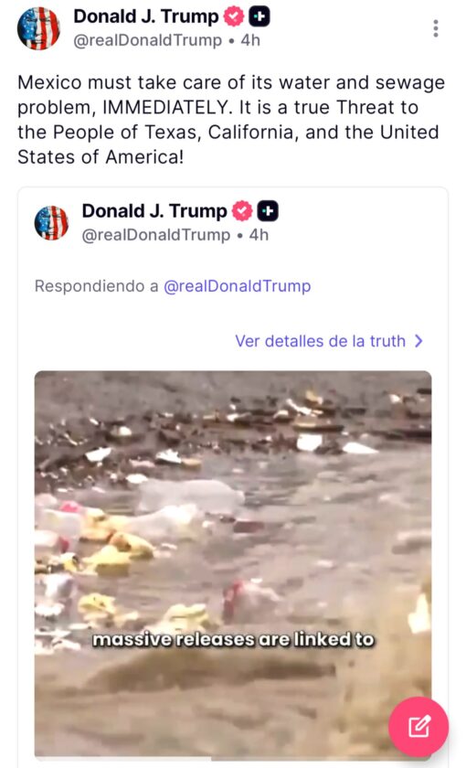 En una publicación en su red social Truth Social, Trump escribió: «México debe solucionar su problema de agua y alcantarillado INMEDIATAMENTE. ¡Es una verdadera amenaza para el pueblo de Texas, California y los Estados Unidos de América!». El mensaje estuvo acompañado de un video que muestra supuestos vertidos de aguas residuales no tratadas en el río Tijuana, que fluye hacia territorio estadounidense.