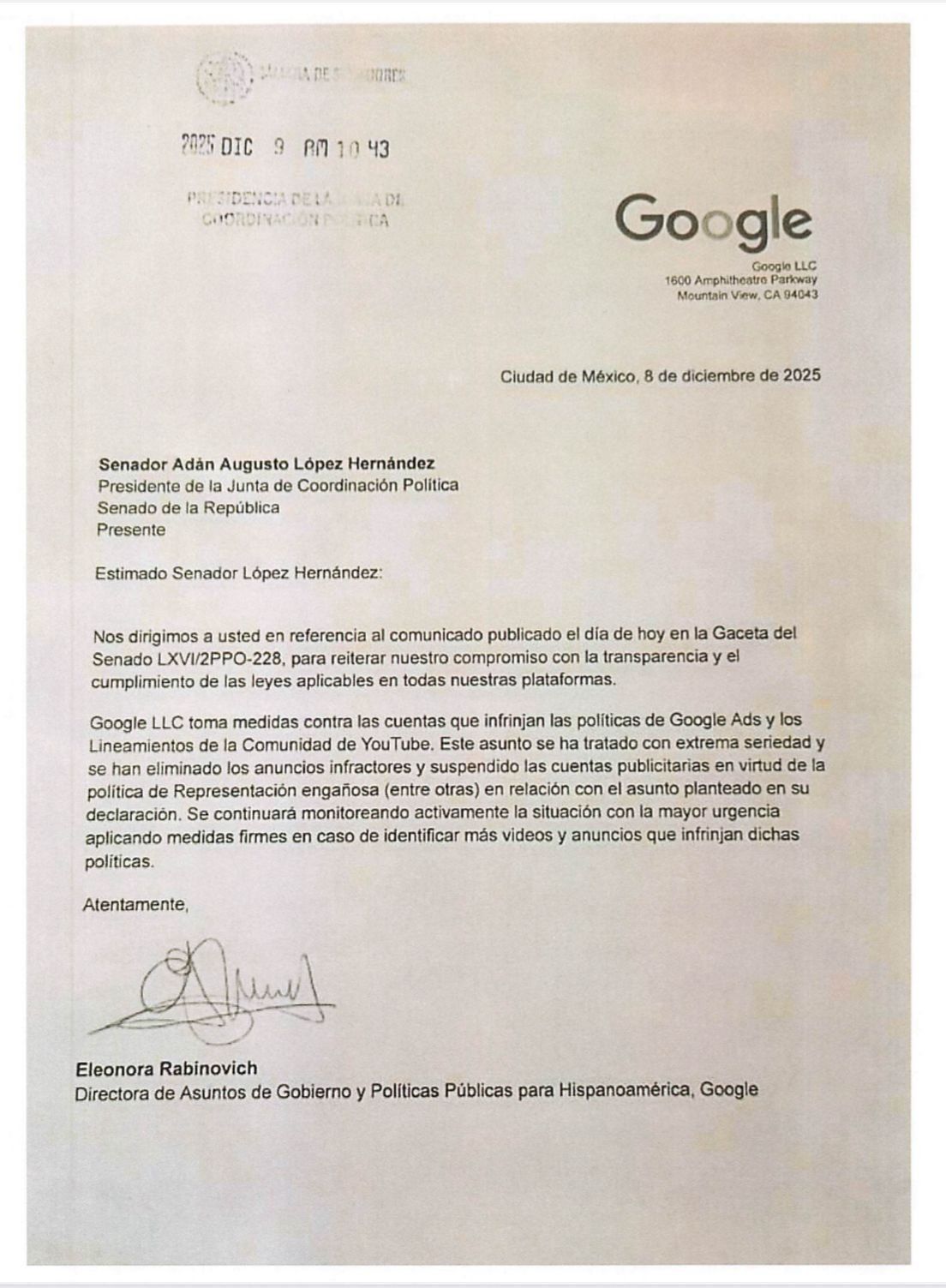 El reclamo del Senado se originó el 8 de diciembre, cuando el presidente de la Junta de Coordinación Política (Jucopo), el senador Adán Augusto López Hernández (Morena), dirigió una carta a Hugo Martínez McNaught, jefe de Relaciones Gubernamentales y Política Pública de Google México. En el documento, se expresó un “profundo extrañamiento” por la difusión de videos generados con IA que aparecían como anuncios patrocinados en YouTube, prometiendo ganancias de hasta 100 mil pesos mensuales o retornos diarios de miles de pesos mediante supuestas inversiones en acciones de Pemex.