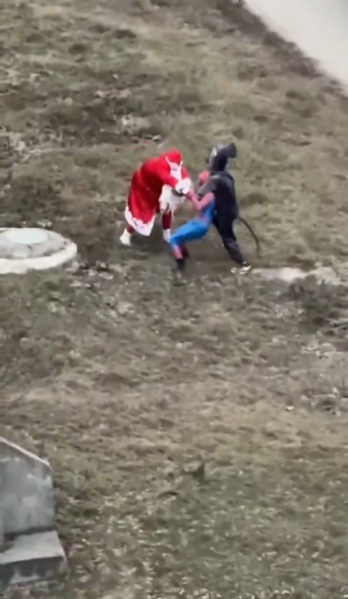 (VIDEO) Pelea épica en las calles de Rusia: Papá Noel, Hombre Araña y un ratón resuelven sus diferencias a puñetazos.