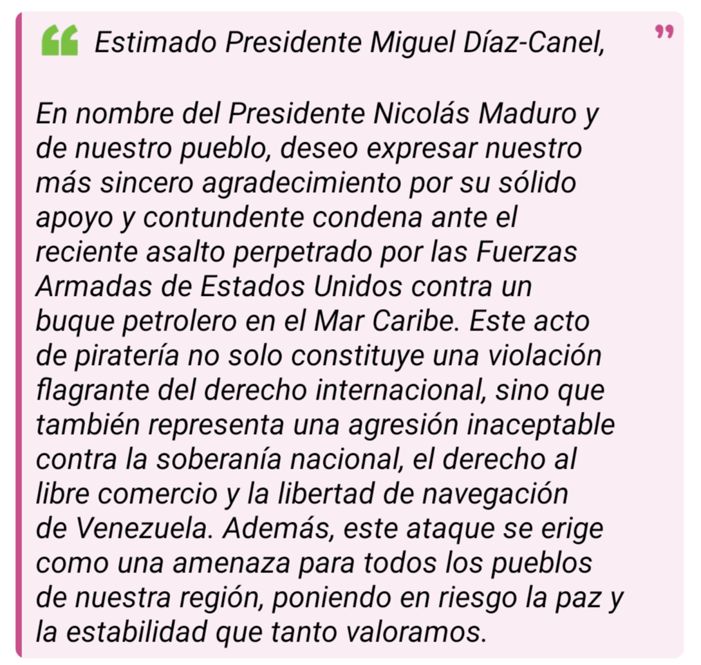 Caracas (RRC): El Gobierno de Venezuela expresó su profundo agradecimiento al pueblo y al Gobierno de Cuba por su firme solidaridad frente a lo que califica como una «agresión inaceptable» por parte de Estados Unidos, en medio de la escalada de tensiones en el Caribe. A través de un comunicado oficial, el Ministerio del Poder Popular para Relaciones Exteriores de Venezuela destacó la condena cubana a las acciones recientes de Washington, incluyendo la confiscación de un buque petrolero venezolano en aguas internacionales y el despliegue militar estadounidense en la región. El…