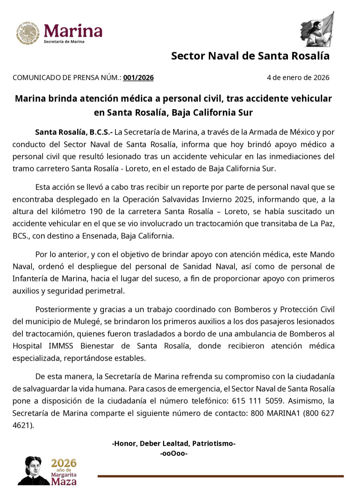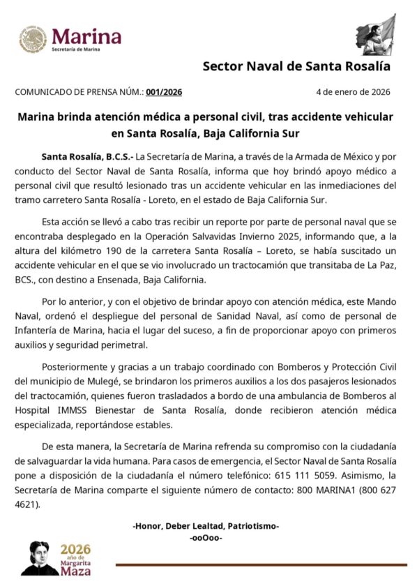 En coordinación con elementos de Bomberos y Protección Civil del municipio de Mulegé, los marinos proporcionaron los primeros auxilios a los dos ocupantes del tráiler, quienes presentaban lesiones. Posteriormente, los afectados fueron trasladados en una ambulancia de Bomberos al Hospital IMSS Bienestar de Santa Rosalía, donde recibieron atención médica especializada. Autoridades reportaron que ambos se encuentran estables.