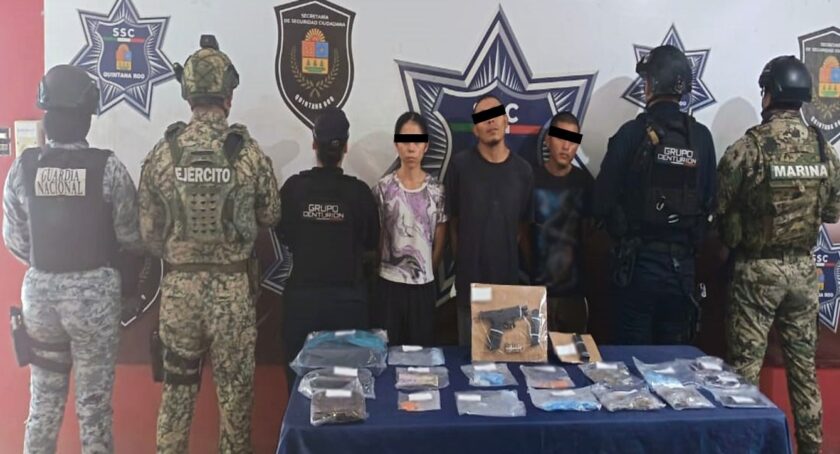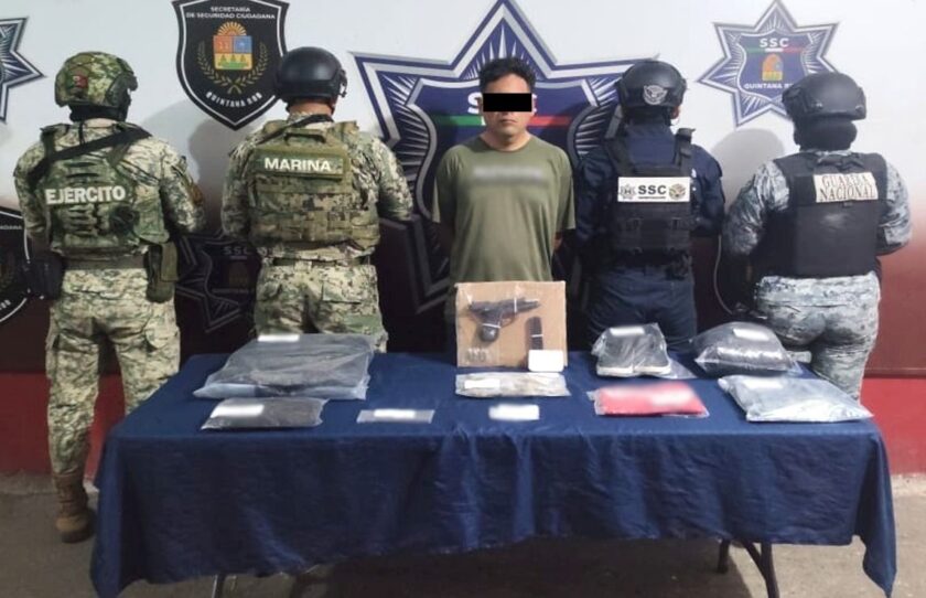 -En Benito Juárez e Isla Mujeres, elementos de GN, Ejército Mexicano, Secretaría de Marina (Semar), Fiscalía y Policía Estatal detuvieron a cuatro personas, les aseguraron dos armas cortas, tres cargadores, 11 cartuchos, 288 dosis de metanfetamina, 39 dosis de cocaína y 108 dosis de marihuana.