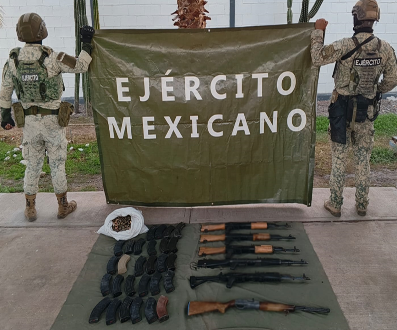 -En San Ignacio, elementos del Ejército Mexicano, al realizar recorridos de seguridad, aseguraron cinco armas largas, 47 cargadores, 2,500 cartuchos y dos chalecos tácticos.