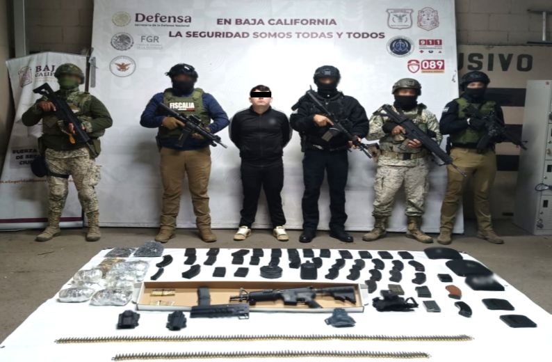 -En Mexicali, elementos del Ejército Mexicano, Fiscalía y Policía Estatal detuvieron a una persona a bordo de un vehículo, aseguraron un arma larga, 43 cargadores, 2,410 cartuchos, un aditamento lanzagranadas, dos cintas eslabonadas y cinco placas balísticas.