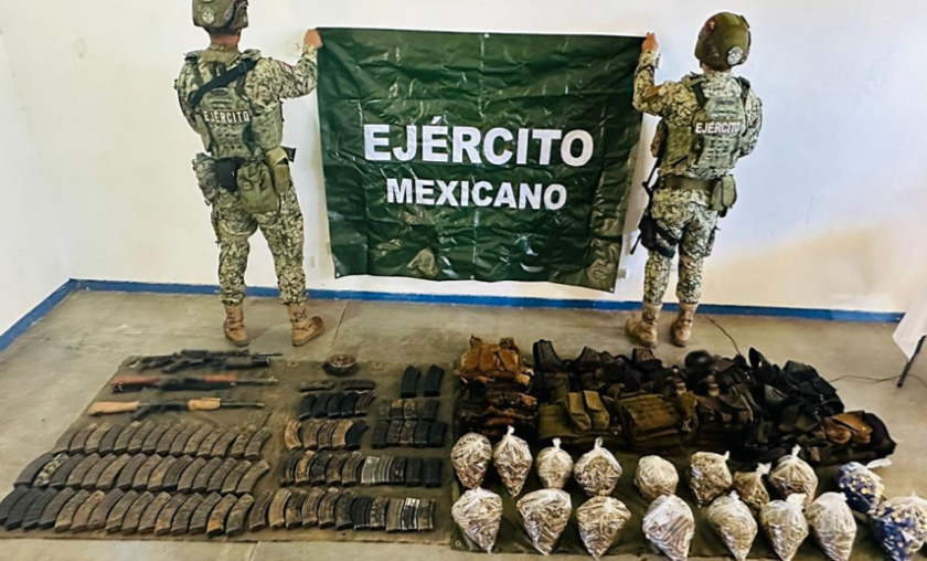 -En Badiraguato, elementos del Ejército Mexicano aseguraron tres armas largas, 89 cargadores, 6,931 cartuchos, un aditamento lanzagranadas, 10 chalecos tácticos y 33 artefactos explosivos improvisados.