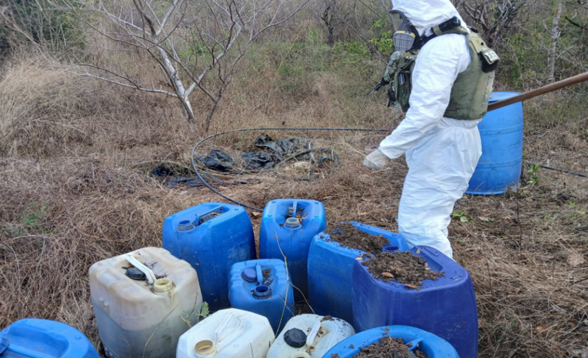 En Culiacán y Cosalá, Sinaloa, en los poblados El Espejo, Los Lobitos, Los Sabinitos, El Guasimal, Potrero de los Ibarra de Arriba, La Cuesta, El Bichi de Arriba, La Ilama, Pueblo Alayá y Agua Caliente de Alayá, El Rincón de la Lagunita, El Palmar de los Fonseca, El Guamúchil y El Reparo, elementos del Ejército Mexicano localizaron e inhabilitaron 17 áreas de concentración de material diverso para la elaboración de metanfetamina, aseguraron 10,480 litros y 25 kilos de sustancias químicas para la elaboración de metanfetamina.