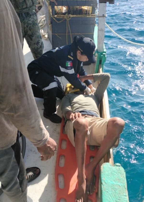 Lo anterior, derivado de un reporte de auxilio recibido, en el que se informó que un tripulante del sexo masculino presentaba convulsiones mientras efectuaba actividades de pesca. De manera inmediata, personal de Sanidad Naval, destacamentada en Isla Pérez, acudió para brindar atención médica inicial.