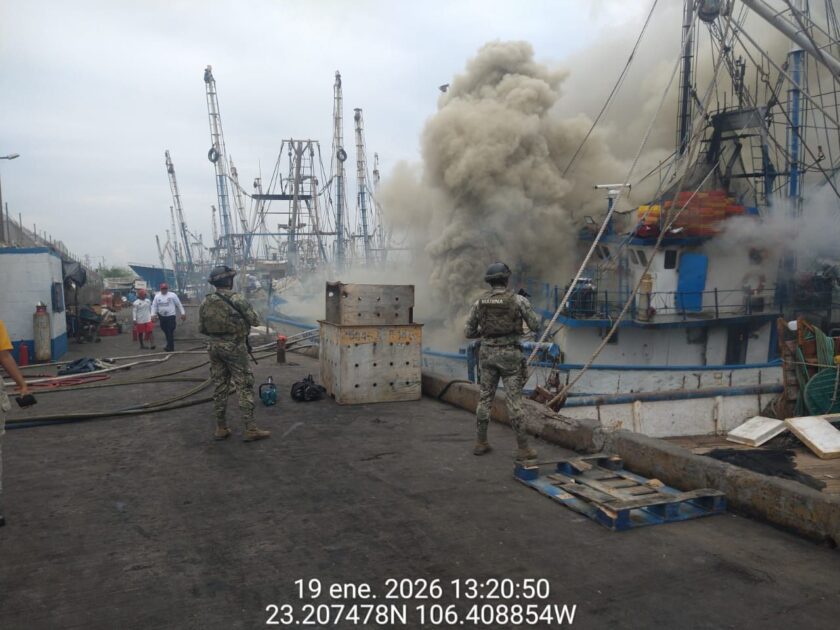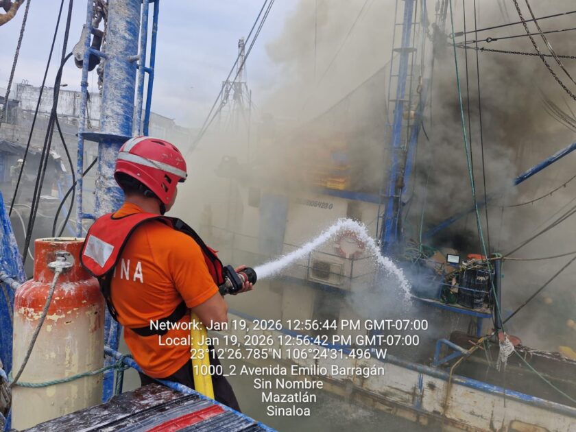 Mazatlán, Sin. – La Secretaría de Marina a través de la Armada de México en funciones de Guardia Costera, informa que hoy personal perteneciente a la Cuarta Región Naval, brindó apoyo en el sofocamiento de incendio de una embarcación camaronera, en Mazatlán, Sinaloa.