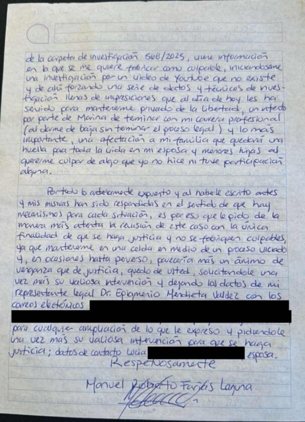 El alto mando naval, con 33 años de servicio ininterrumpido en la Armada de México, relata que su detención ocurrió el 2 de septiembre de 2025 en su oficina de la Inspección de la Décima Zona Naval en Salina Cruz, Oaxaca. Acusa a las autoridades de basar su vinculación a proceso en evidencias débiles, como un supuesto video de YouTube “inexistente” con datos imprecisos y técnicas de investigación forzadas.