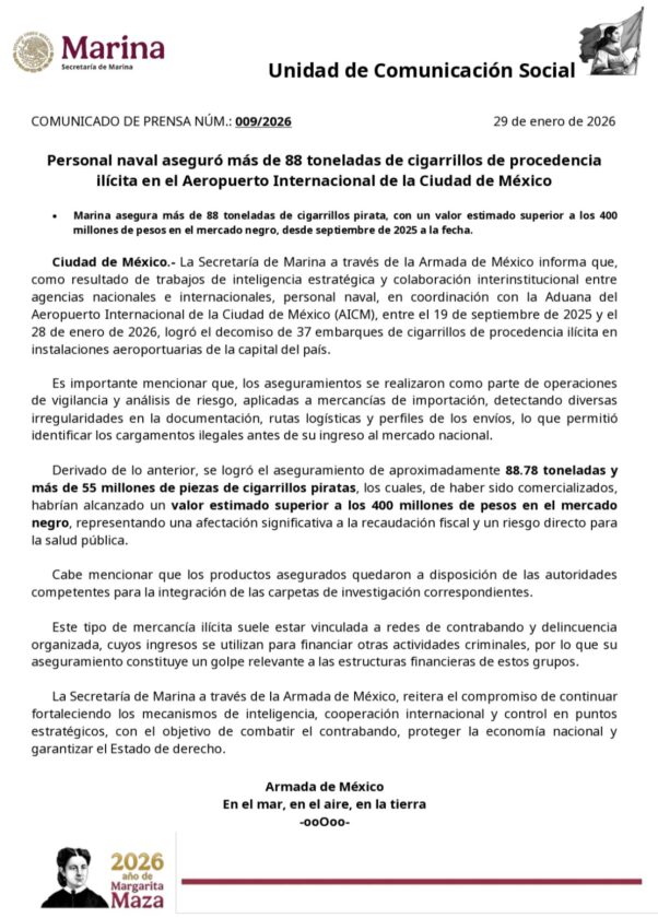 Ciudad de México (RRC): La Secretaría de Marina (Semar), a través de la Armada de México, reportó el decomiso de más de 88 toneladas de cigarrillos de procedencia ilícita en el Aeropuerto Internacional de la Ciudad de México (AICM), en una serie de operaciones que se extendieron desde septiembre de 2025 hasta el 28 de enero de este año. El valor estimado de la mercancía en el mercado negro supera los 400 millones de pesos.