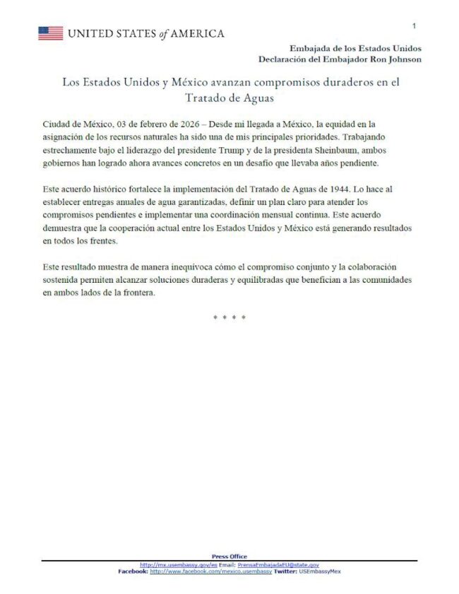 El nuevo plan técnico surge tras meses de intensas negociaciones técnicas y políticas entre ambas naciones, en un contexto de sequía histórica que ha reducido significativamente los caudales disponibles en la cuenca. Según el comunicado oficial, México reafirma su compromiso con el tratado y confirma su disposición a garantizar entregas mínimas anuales acordadas, ajustadas a las condiciones hidrológicas reales y priorizando siempre el derecho humano al agua, el consumo doméstico y la producción agrícola en territorio nacional.
