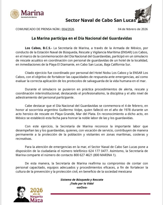 La Secretaría de Marina (Semar), a través de la Armada de México, participó activamente en la conmemoración del Día Nacional del Guardavidas, celebrado el 4 de febrero, con un simulacro de rescate acuático en Los Cabos, Baja California Sur.