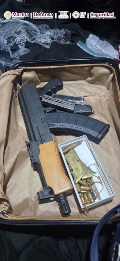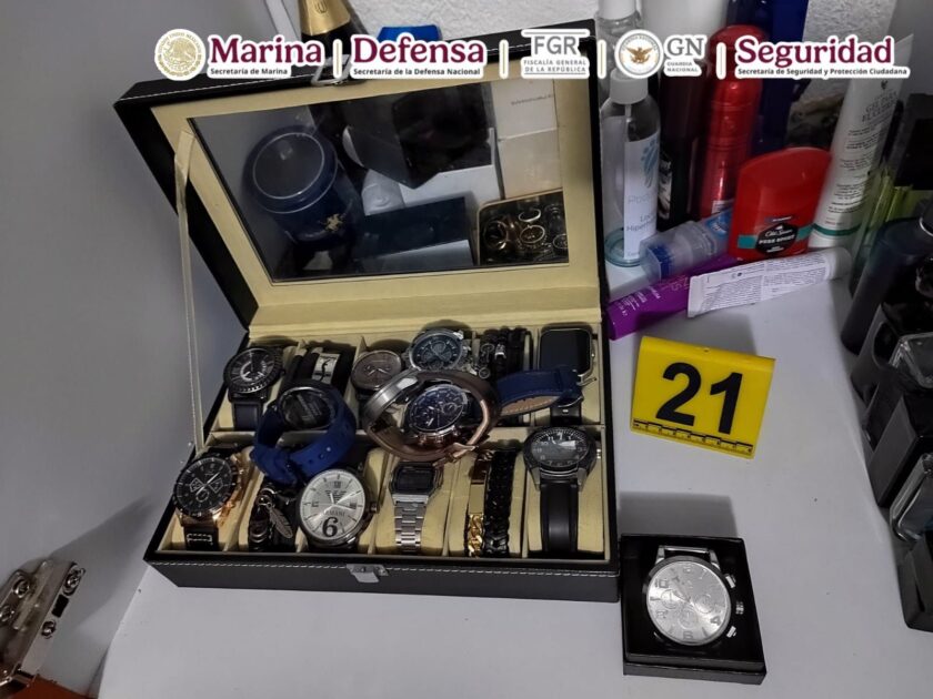Durante las intervenciones en los inmuebles cateados, las autoridades aseguraron armas de fuego, cartuchos útiles, dosis de diversas sustancias ilícitas, dinero en efectivo, vehículos, equipos de telefonía celular y dispositivos de almacenamiento de información.