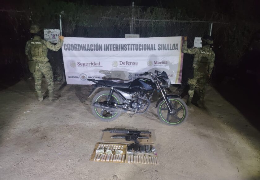 En un segundo evento, ocurrido en el poblado Los Tanques, municipio de Elota, elementos de la Armada observaron a un hombre que, al notar su presencia, huyó de manera evasiva. El individuo abandonó un vehículo, dos armas largas, un cargador y 25 cartuchos útiles.
