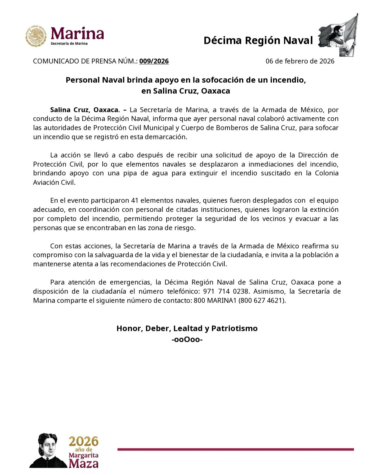 Salina Cruz, Oaxaca (RRC): Elementos de la Secretaría de Marina (Semar), a través de la Décima Región Naval, colaboraron de manera activa con Protección Civil Municipal y el Cuerpo de Bomberos para controlar y extinguir por completo un incendio registrado en la colonia Aviación Civil de este puerto oaxaqueño. La intervención ocurrió ayer tras recibir una solicitud formal de apoyo por parte de la Dirección de Protección Civil local. De inmediato, personal naval se trasladó al lugar de los hechos con una pipa de agua y el equipo necesario para…
