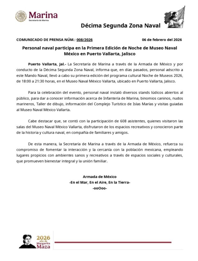 Puerto Vallarta, Jalisco (RRC): La Secretaría de Marina (Semar), a través de la Armada de México y la Décima Segunda Zona Naval, llevó a cabo con gran éxito la primera edición del programa cultural Noche de Museos 2026 en el Museo Naval México Vallarta, ubicado en esta ciudad costera.