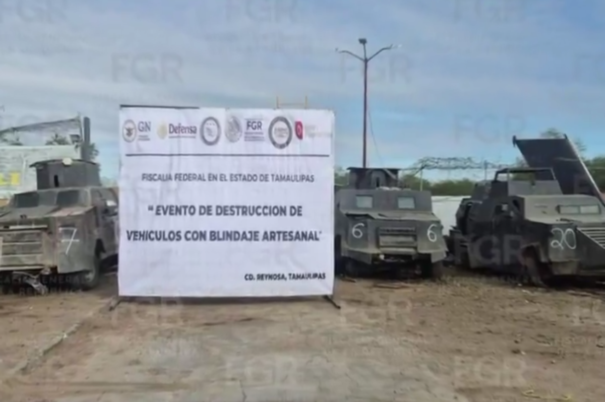 Tamaulipas (RRC): La Fiscalía General de la República (FGR) llevó a cabo la destrucción de 23 vehículos con blindaje artesanal, conocidos popularmente como «monstruos«, en cumplimiento del Programa «Destino de Bienes y Objetos del Delito». De acuerdo con información oficial, estos vehículos estaban relacionados con 21 expedientes de investigación y fueron asegurados durante diversas acciones de seguridad en el estado de Tamaulipas, coordinadas por el Gabinete de Seguridad y en colaboración con autoridades federales y estatales. Los llamados «monstruos» son unidades modificadas de manera artesanal, generalmente camionetas pick-up reforzadas con…