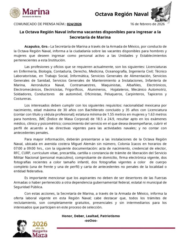 Guerrero (RRC): La Octava Región Naval, con sede en Acapulco, Guerrero, abrió una convocatoria de vacantes para que hombres y mujeres se integren como personal activo a la Secretaría de Marina (SEMAR) y la Armada de México.