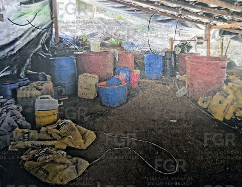 En el predio se encontraron inicialmente: 15 tanques de gas, 45 recipientes de plástico vacíos de distintas capacidades, 25 tambos vacíos, 72 bidones vacíos, dos hornos artesanales, un tinaco de mil 100 litros vacío, 27 bidones de 20 litros con sustancia líquida y 13 costales de 25 kilos con hidróxido de sodio.