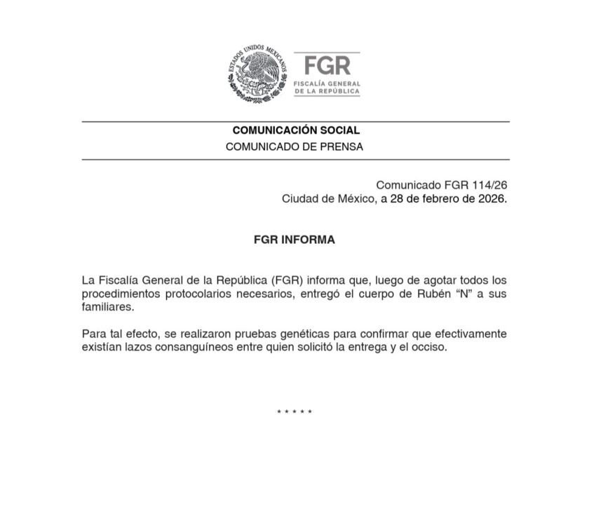 A través del Comunicado FGR 114/26, la dependencia detalló que la entrega se realizó “luego de agotar todos los procedimientos protocolarios necesarios”. Como parte del proceso, se llevaron a cabo pruebas genéticas para verificar de manera concluyente los lazos consanguíneos entre la persona que solicitó el cuerpo y el occiso, garantizando así el cumplimiento estricto de los requisitos legales.