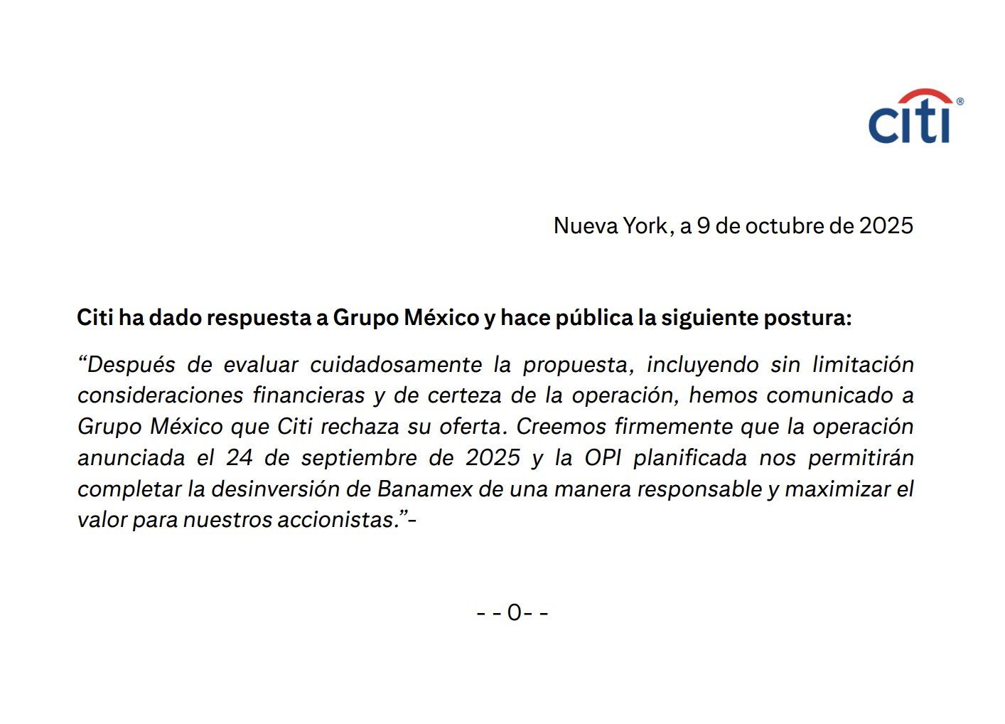 Citigroup (Citi) ha rechazado formalmente la oferta presentada por Grupo México, el conglomerado liderado por el empresario Germán Larrea, para adquirir el 100% de las acciones de Banamex. Esta decisión se anunció, apenas unos días después de que Grupo México hiciera pública su propuesta el 3 de octubre. El grupo minero e industrial propuso una transacción «vinculante» para comprar hasta el 100% de Banamex, con términos que describieron como «más atractivos» para Citi. La oferta valoraba al banco en alrededor de 9,300 millones de dólares y buscaba mantenerlo mayoritariamente en…