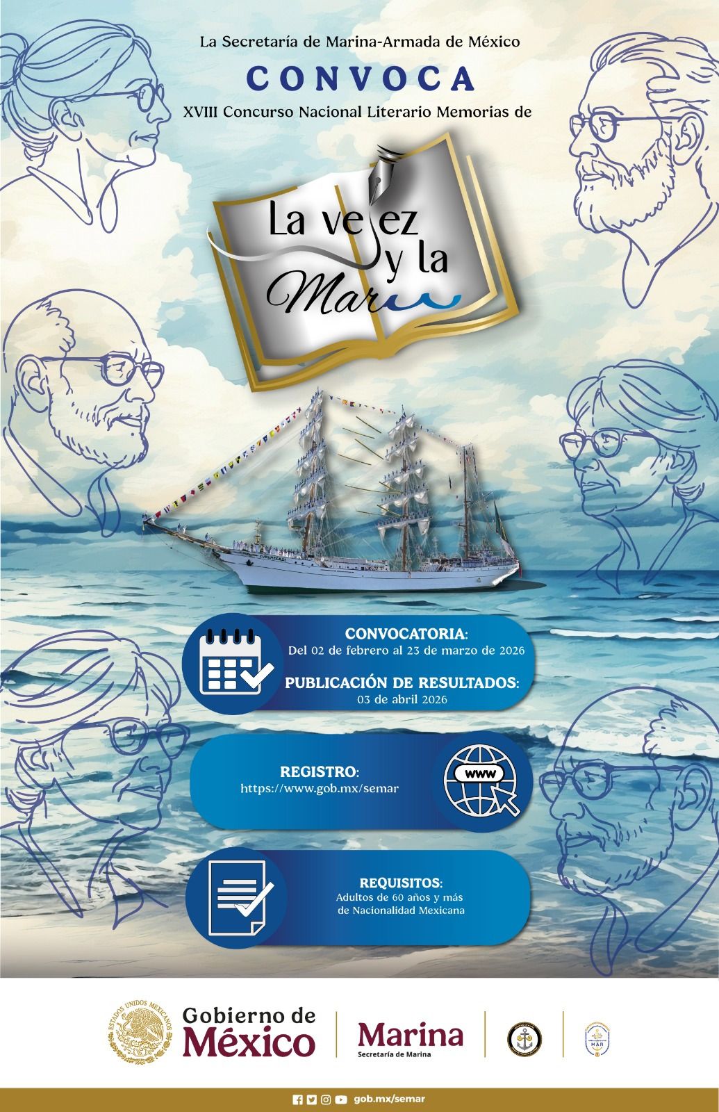 Ciudad de México (RRC): La Secretaría de Marina-Armada de México (Semar) abrió la convocatoria para el XVIII Concurso Nacional Literario «Memorias de La Vejez y la Mar» 2026, dirigido a personas de 60 años o más, con el objetivo de fomentar la expresión creativa sobre el mar y promover la conciencia ecológica marítima. El certamen busca motivar a los adultos mayores mexicanos a compartir sus percepciones y sentimientos respecto al océano, así como incentivar el interés por las actividades marítimas y navales. Según la dependencia, esta iniciativa forma parte de…