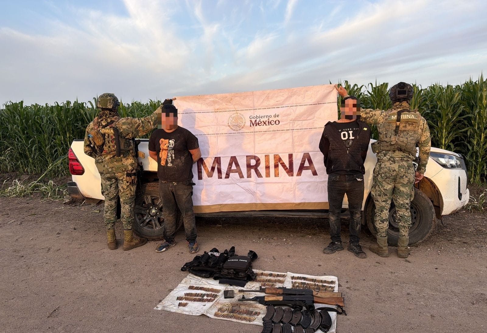 Mazatlán, Sinaloa (RRC): Elementos de la Secretaría de Marina (Semar), a través de la Armada de México y la Cuarta Región Naval, detuvieron a dos presuntos infractores de la ley durante un recorrido terrestre en el municipio de Elota, Sinaloa, donde también aseguraron un vehículo, armas largas, municiones y equipo táctico. El operativo se realizó en la carretera Caimanes-Zapata, según informó la Semar en un comunicado. Los marinos interceptaron un vehículo tipo pick up en el que viajaban los dos individuos, a quienes se les decomisaron dos armas largas, 367…