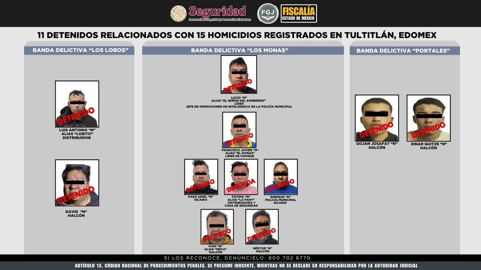 Ciudad de México (RRC): Autoridades federales y del Estado de México detuvieron a 11 personas —10 hombres y una mujer— presuntamente vinculadas con al menos 16 homicidios cometidos en los municipios de Tultitlán y Coacalco, así como con la venta y distribución de drogas. La operación fue resultado de un trabajo coordinado de inteligencia e investigación entre la Secretaría de la Defensa Nacional (Sedena), la Secretaría de Marina (Semar), la Fiscalía General de la República (FGR), la Guardia Nacional (GN), la Secretaría de Seguridad y Protección Ciudadana (SSPC) —encabezada por…