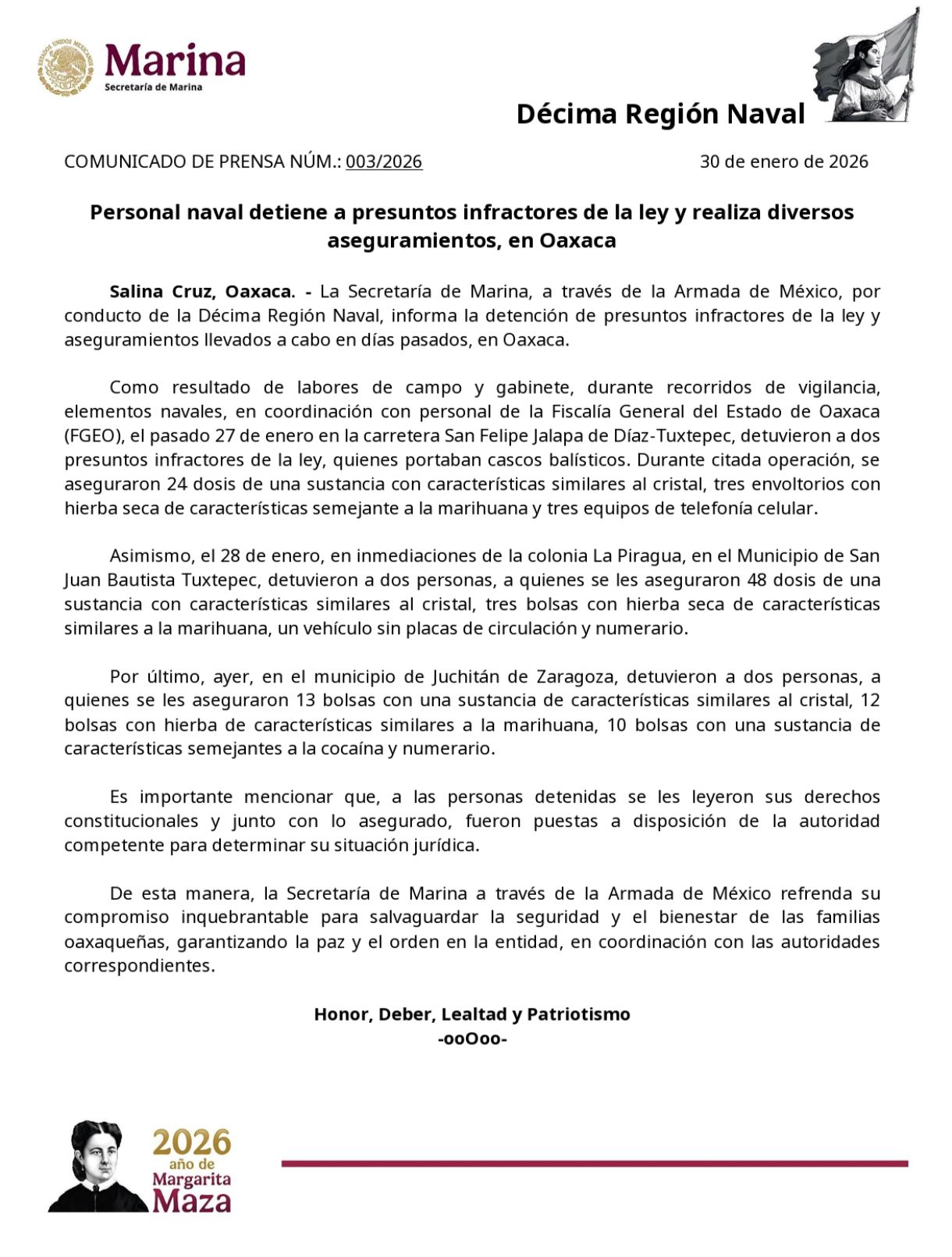 Oaxaca (RRC): La Secretaría de Marina (Semar), a través de la Armada de México y la Décima Región Naval, reportó la detención de seis presuntos infractores de la ley en diferentes puntos de Oaxaca durante los últimos días de enero de 2026. Las acciones se realizaron en coordinación con la Fiscalía General del Estado de Oaxaca (FGEO) y derivaron en el aseguramiento de diversas dosis de presuntas drogas, vehículos y otros objetos. Los operativos forman parte de las labores permanentes de vigilancia y combate al narcomenudeo en la entidad. En…
